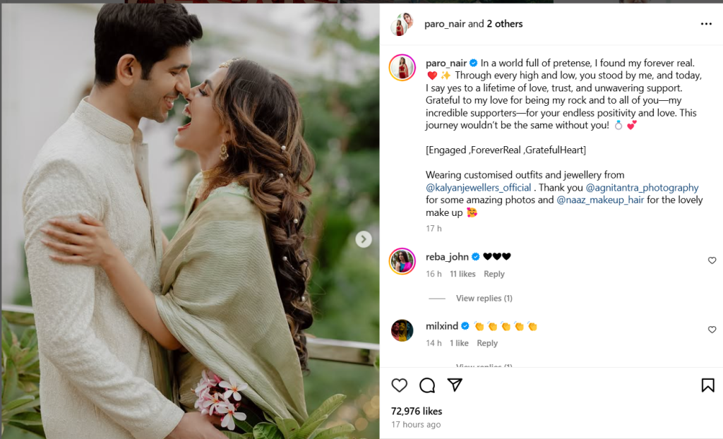 Parvati shared the photos and wrote, “In a world full of show-off, I found my forever real. Through every up and down, you stood by me, and today, I say yes to a lifetime of love, trust, and full support. Thankful to my love for being my strength and to all of you—my amazing well-wishers—for your nonstop good vibes and love. This journey wouldn’t be the same without you!”