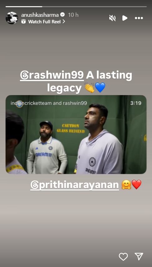 His sudden decision to retire shocked many, but over time, people accepted it. Fans and former cricketers from all over the world wished him the best for his future. Anushka, who is married to Virat Kohli, also joined in, calling Ashwin a ‘lasting legacy’ and tagged his wife, Prithi Narayanan, in her Instagram story.