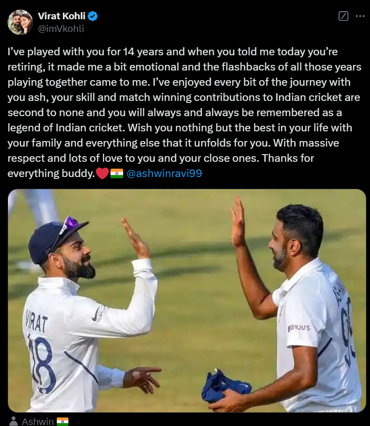 Virat Kohli, former Indian captain, also expressed his deep appreciation for Ashwin’s contribution to the team. Kohli highlighted Ashwin’s match-winning abilities and said he would always be remembered as a legend. Kohli had even embraced Ashwin during a rain break on Day 5 of the Brisbane Test, which led to retirement rumors that later came true after the match ended.