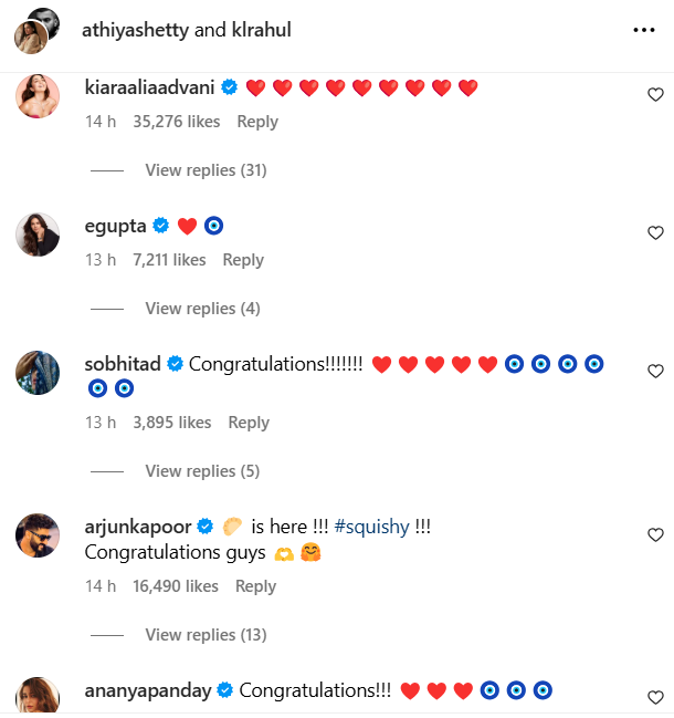 Many Bollywood celebrities and cricketers congratulated the couple. Kiara Advani, Arjun Kapoor, Masaba Gupta, and several other well-known personalities sent their love and best wishes to the new parents.