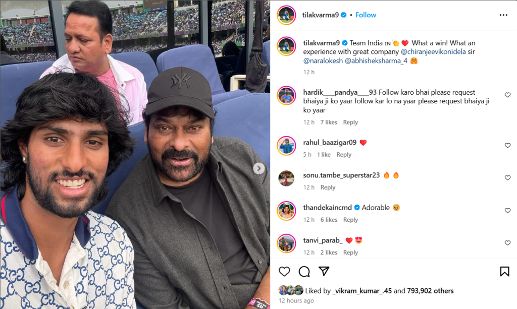 Later, cricketer Tilak Varma also shared his excitement on social media. He posted pictures with Chiranjeevi and wrote, “Team India! 🇮🇳 What a win! What an experience with great company @chiranjeevikonidela sir @naralokesh @abhisheksharma_4.”