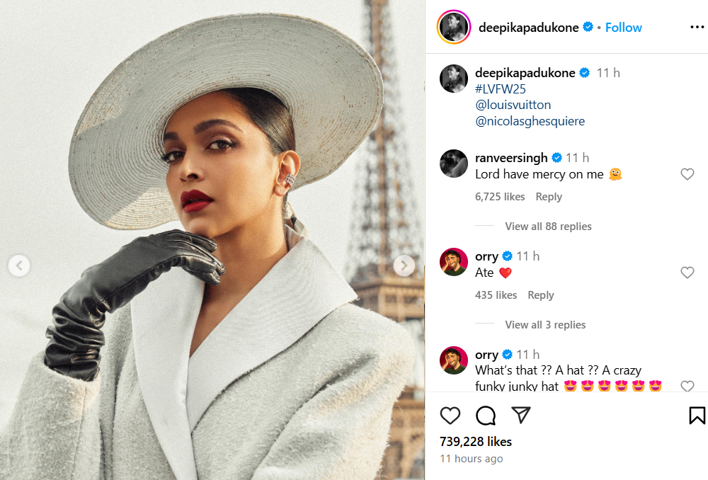 As a key face for Louis Vuitton, Deepika continues to make an impact in the fashion industry. She recently captivated audiences in a stunning black outfit for Cartier’s 25th Anniversary celebration in Dubai, followed by an appearance at the Forbes Summit in Abu Dhabi, where she dazzled in a golden ensemble. Being the first Indian House Ambassador for Louis Vuitton marks a significant milestone in her career. Fans have been showering her with admiration online, calling her latest look “iconic” and referring to her as a “holy iconic queen.” Social media was flooded with reactions such as “Deepika is a vision,” and “Now the Eiffel Tower has competition in beauty!” Her husband, actor Ranveer Singh, also left a playful comment, writing, “Lord have mercy on me.”
