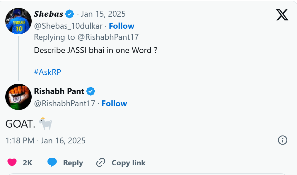 Star Indian wicketkeeper-batter took to X on Wednesday to answer fans’ questions. During the session, when asked to describe his teammate Jasprit Bumrah in one word, he gave the ultimate compliment by calling him “GOAT” (Greatest of All Time).