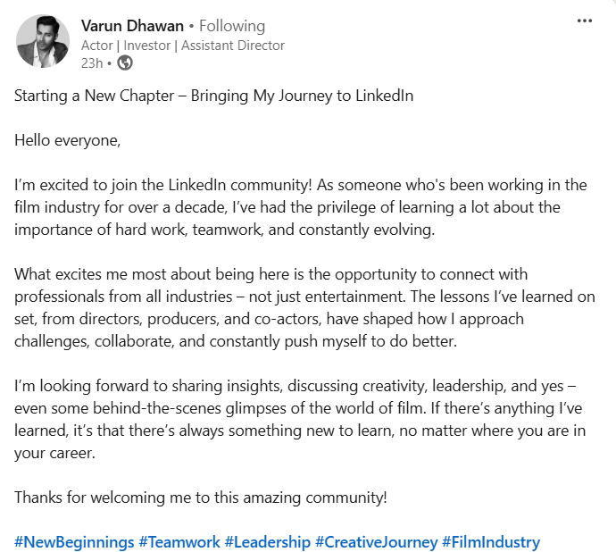 In his first post, Varun called it a ‘new chapter’ and addressed the LinkedIn community. He wrote, “After working in the film industry for more than 10 years, I’ve learned the importance of hard work, teamwork, and adapting to changes.”