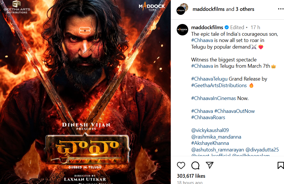 “The great story of India’s brave son, #Chhaava, is now ready to shine in Telugu because of popular demand. Watch the grand release of #Chhaava in Telugu from March 7th. #ChhaavaTelugu Grand Release by #GeethaArtsDistributions.”